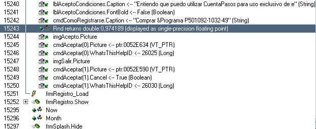 Random numbers for random buttons It's recommended to read about VB cracking before you continue if you don't know anything about SmartCheck. You should read Esiel2's tutorial CRACKEANDO EN VISUAL BASIC (yes, in Spanish). If we try to open the executable with SmartCheck, we'll find something like: It sounds like 'Danger, mines'. We go on. We aren´t going to need logging API calls, so you can disable this option. Run Cuentapasos with SmartCheck and watch the film.Check the position on the 'Aceptar' button, and click on 'Salir'. Now, we're interested on locate where the program decides the position of these buttons. Look for the the frmRegistro_Load event, which is going to load the nag screen. At the end of this event we find this: