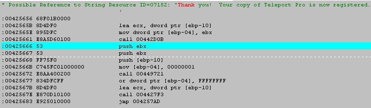 Eureka! I do believe we've found it!. Write down the code location of the line before the CMP statement. (i.e. 425643) (which is PROBABLY the call to the routine that calculates the serial number if you're interested in trying a keygen). Shut down W32Dasm, fire up Teleport Pro and set a bpx on CS:425643, (or, break on GetWindowTextA and step through using F10 until you get to this location). Try to register the program ..... SoftICE breaks.