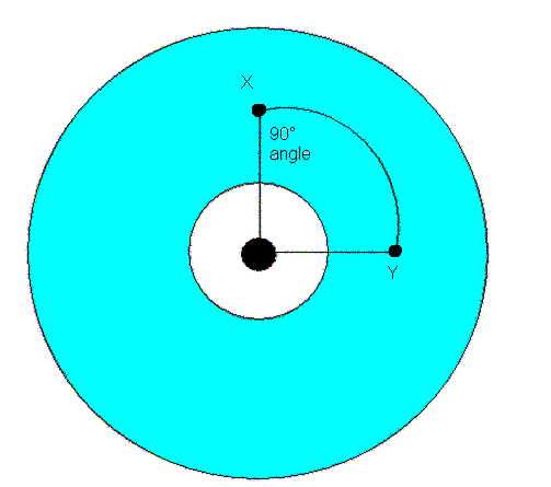 Now, you can imagine each sector on the disc not only as on a line, but also as an angle in relation to another sector. For example, in the diagram below, sectors X and Y are at a 90° angle to each other.