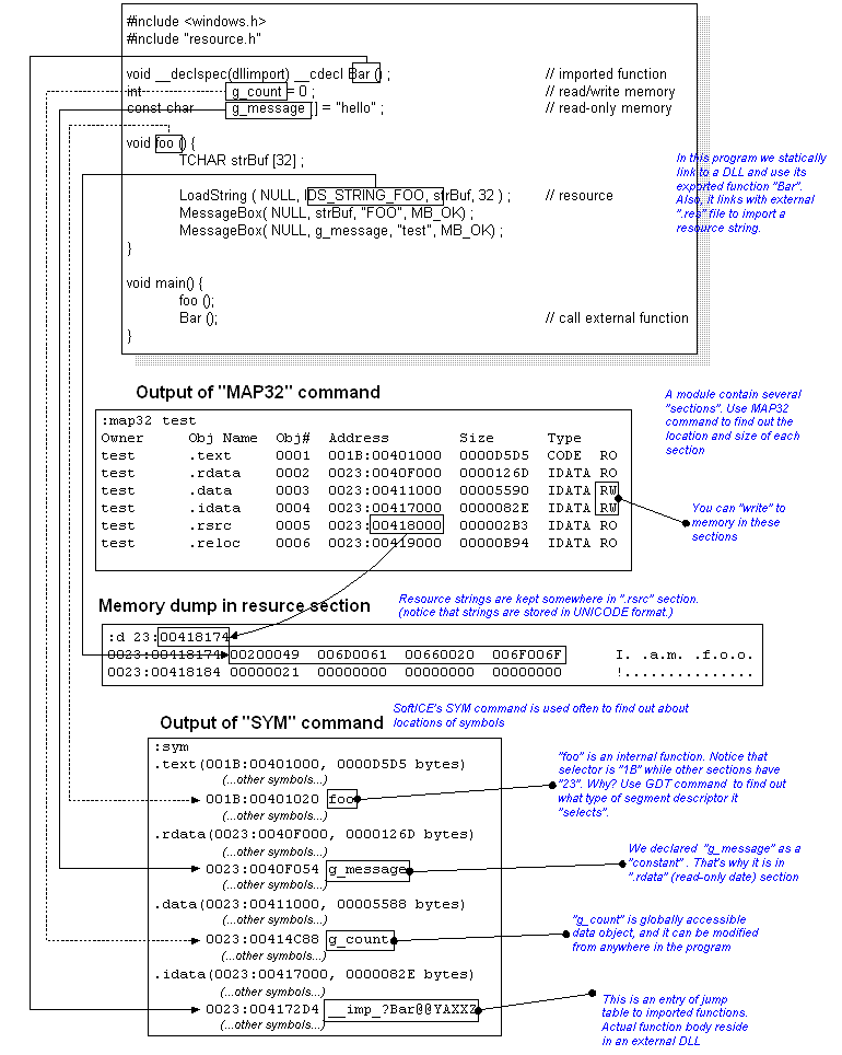 How to access objects in various sections of a PE file with SoftICEA PE format executable file contains several sections. Each section contain a group of objects with the same type of attributes. For instance, all "instructions" are combined to a section and labeld as ".text" by Visual C++ linker. Likewise, all the resource elements are put together and placed under ".rsrc" section.The following figure shows how most programming elements (e.g. global variabe, imported function, etc.) are organized and how SoftICE shows that information with its "MAP32" command. If you have loaded symbol information for the subject module, SoftICE will give you are list of symbols and their associated addresses with "SYM" command. This way, you can refer to most of the programming elements with symbolic name. Many SoftICE command also takes symbol name as its parameter, and it will resolve to a linear address if the symbol is listed in the symbol table. The sample program below has